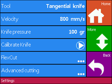 All cutter activity can be initiated from the 320x240 dot color touch panel. The panel displays information about the cutter’s current status and/or actions that need to be taken. In case the touch screen behaves strange, it may be necessary to recalibrate the screen.